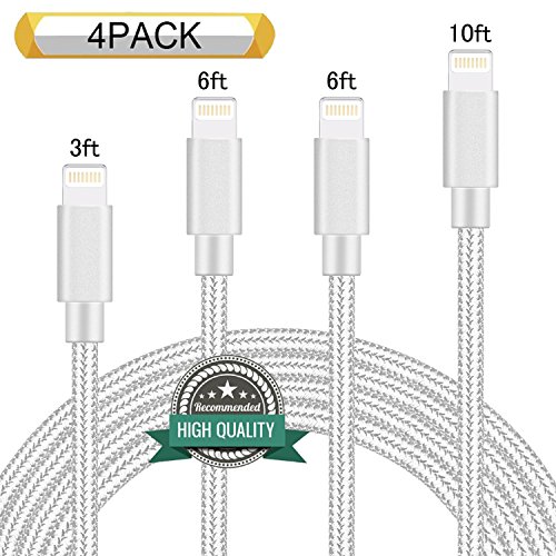 Youer Lightning Cable 4Pack 3FT 6FT 6FT 10FT Nylon Braided Certified iPhone Cable USB Cord Charging Charger for Apple iPhone 8, X, 7, 7 Plus, 6, 6s, 6+, 5, 5c, 5s, SE, iPad, iPod Nano, Touch (Silver)