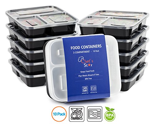 Chef’s Star 3 Compartment Reusable Food Storage Containers with Lids – Microwave Safe – Dishwasher Safe – Bento Lunch Box – Stackable – 10 Pack
