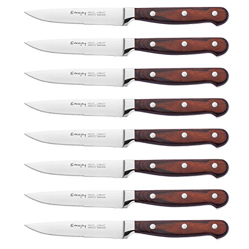 Steak knives, Emojoy Steak knife set of 8, Stainless Steel Steak Knives Serrated, German Stainless Steel with Highly Resistant and Durable Pakkawood Handle, for Pizza or Steak