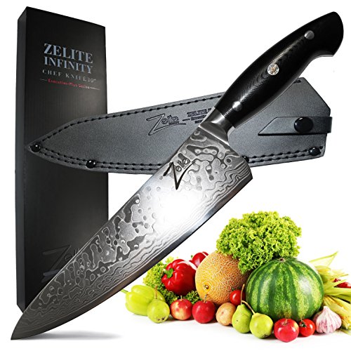 ZELITE INFINITY Chef Knife 10 Inch >> Executive-Plus Series >> Best Quality Japanese AUS10 Super Steel 45 Layer Damascus, Incredible G10 ‘Hump Back’ Handle, Full-Tang, Ultra-Deep 60mm Chefs Blade