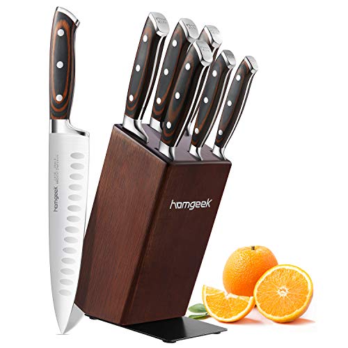 Kitchen Knife Set 8 Piece with Oak Wooden Block Sharpener and Pakkawood Handle, homgeek High Carbon 1.4116 Stainless Steel Professional Sharp Knife Block Set Chef Knife set Forged, Full-Tang Design