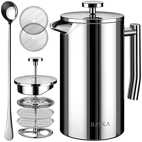 BAYKA French Press Coffee and Tea Maker, 34oz Double-Wall Stainless Steel Metal Insulated Pot with 4 Level Filtration System, Rust-Free, Dishwasher Safe