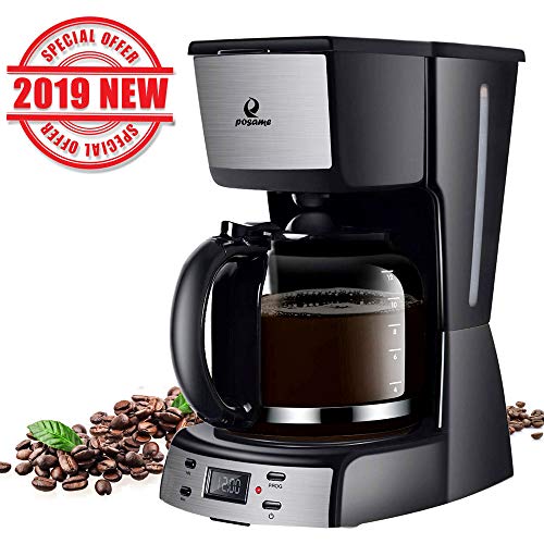 Posame Electric Coffee Makers-12 Cup Programmable Smart Drip Coffee Maker Brew Machine with 1.8L Glass Carafe Black, LED Digital Screen, Removable Mesh Filter Basket, Black/Stainless Steel