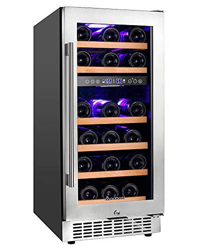 【Upgraded】Aobosi 15 Inch Wine Cooler Dual Zone 28 Bottle Freestanding and Built-in Wine Refrigerator with Stainless Steel Tempered Glass Door & Temp Memory Function,Blue LED Light,Fit Champagne Bottle