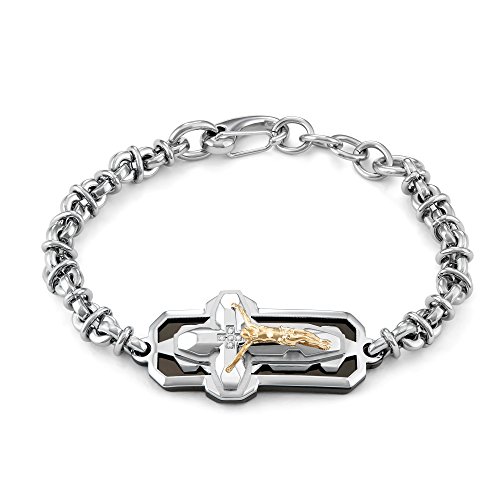 Mens Two Tone Diamond Crucifix Cross Bracelet, Stainless Steel with Black IP plating, 0.025 CTTW, 9″ long