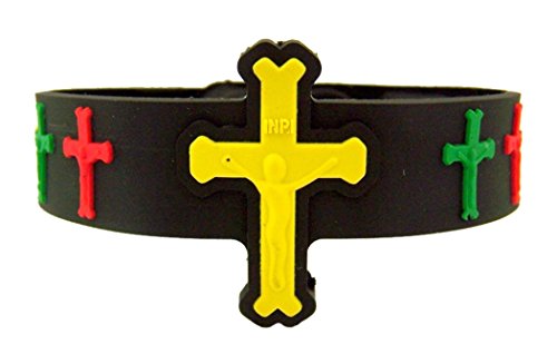 Rubber Bracelet with Multi Color Catholic Cross Crucifix on Band, 8 Inch