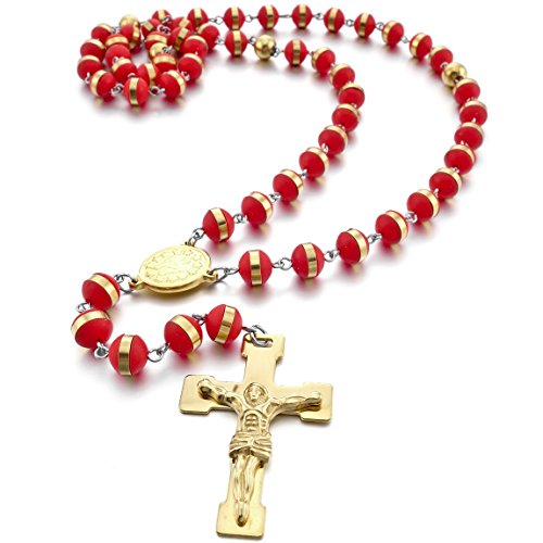 INBLUE Men,Women’s Stainless Steel Rubber Pendant Necklace Gold Tone Red Virgin Mary Jesus Christ Crucifix Cross Rosary 26 Inch Chain