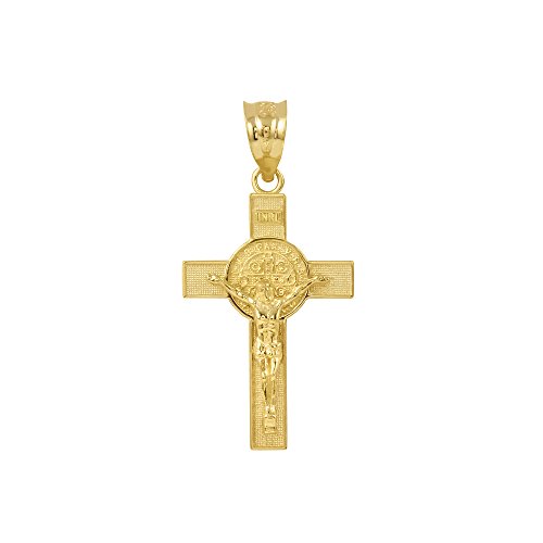 Solid 14k Yellow Gold St. Benedict Crucifix Cross Charm Pendant (1.10″)