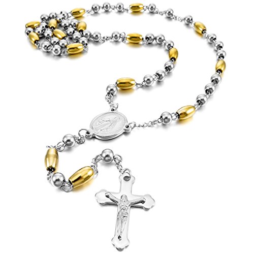 INBLUE Men,Women’s Stainless Steel Pendant Necklace Silver Gold Tone Virgin Mary Jesus Christ Crucifix Cross Bead Rosary 26 Inch Chain