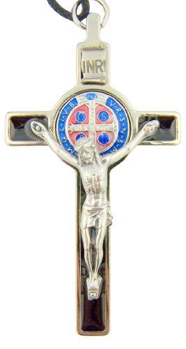 Saint St Benedict Black Red Blue Enamel Medal Cross Crucifix Pendant with Cord Chain