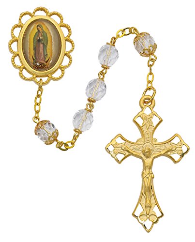 Women’s 7mm Clear Beaded Our Lady of Guadalupe Rosary with Gold-Plated Pewter Crucifix