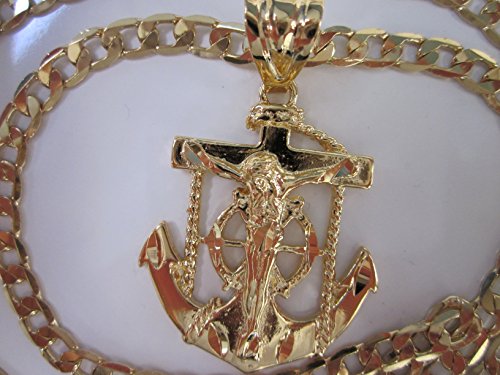 14 Karat Heavy Gold Plated 5 Mm 24 Inch Chain and Medium Size Jesus Christ Cross Crucifix Anchor Pendant Necklace
