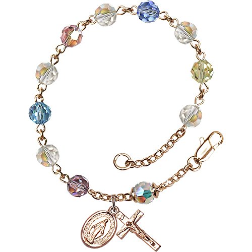 14kt Yellow Gold Filled Rosary Bracelet 6mm Multi-Color Swarovski, Austrian Tin Cut Aurora Borealis beads, Crucifix sz 5/8 x 1/4.