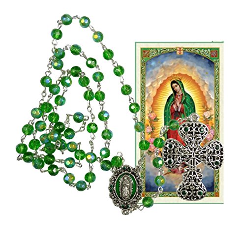 Lady Guadalupe Green Glass Faceted Beads Rosary Miraculous Dangle Filigreed Crucifix Blessed Prayer Card