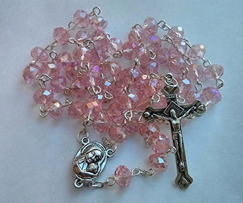 Light Pink Crystal Beads Rosary Catholic Necklace Miraculous Medal & Crucifix