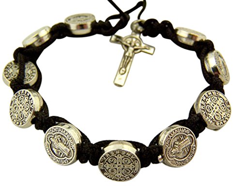 Silver Toned Base Saint Benedict Medal and Crucifix on Black Cord Bracelet, 7 Inch
