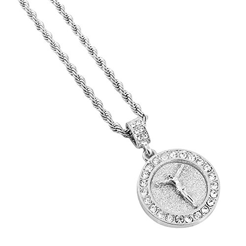 Mens Silver-Tone Hip Hop Bling Stardust Jesus Crucifix Halo Medallion 3mm 24″ Rope Chain
