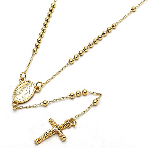 Yellow Gold-Tone Men or Woman Virgin Maria and Crucifix Design and Polished Finish thin Rosary 3 MM (18in x .13in)