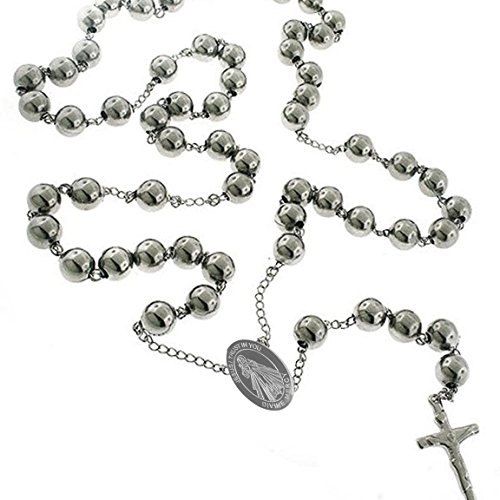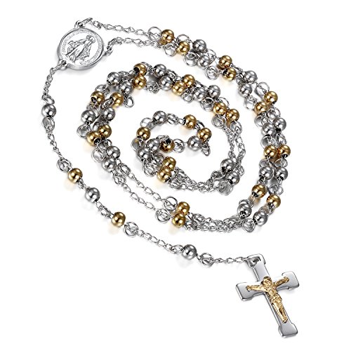 Flongo Men’s Womens Vintage Stainless Steel Virgin Mary Jesus Christ Crucifix Cross Rosary Beads Pendant Necklace, 32 inch Chain