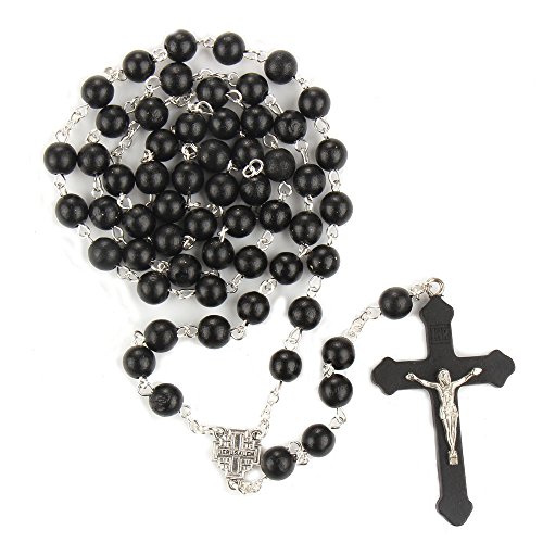 Catholic Rosary Black Wood Prayer Beads Mens Womens Crucifix Necklace Religious