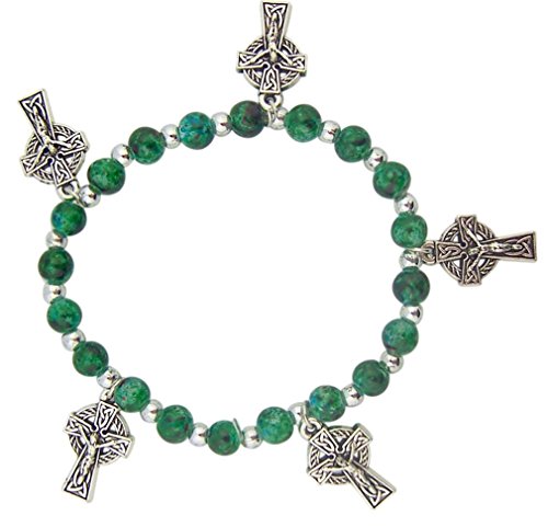 Green Bead with Celtic Crucifix Cross Charm 6-inch Stretch Bracelet