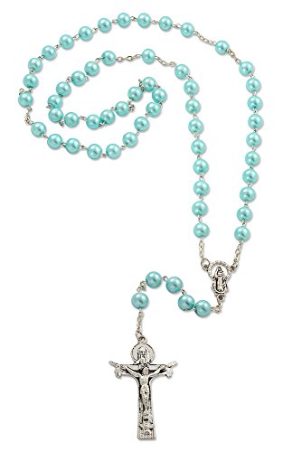 Turquoise Glass Simulated Pearl 8mm Beads Rosary with Holy Trinity Crucifix Cross, Made in Italy, 20 Inch