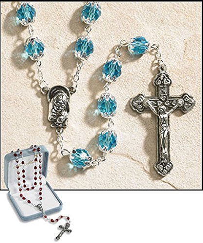 Ave Maria March Aquamarine Double Capped Birthstone Rosary 25 Inches 1.75″ Crucifix