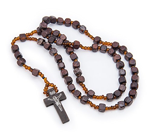 7MM Catholic Crucifix Dark Brown Wood Square w/ small Brown Bead Rosary natural Desing Finish Necklace