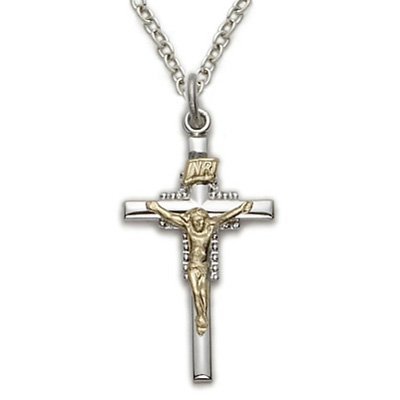 Sterling Silver Two Tone Crucifix with Gold Tone INRI and Corpus, 7/8 Inch