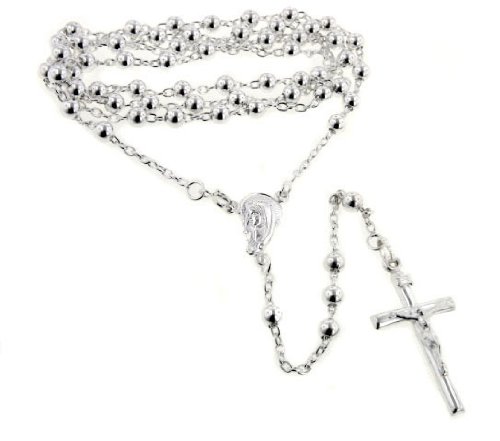 Thick 5mm Catholic Sterling Silver Rosary Beads 30″ Necklace with Crucifix, Gift Boxed