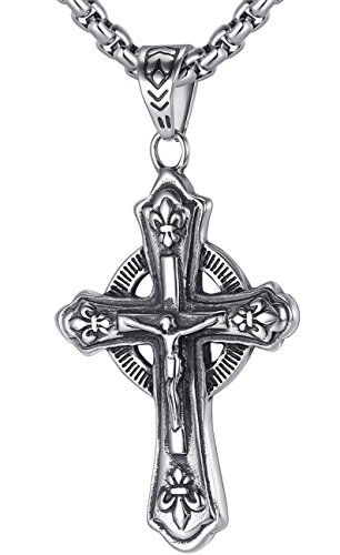 LineAve Men’s Stainless Steel Jesus Christ Crucifix Celtic Cross Pendant Necklace, 23″ + 2″, 8a0034