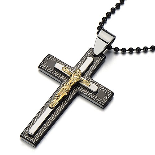 Mens Steel Jesus Christ Crucifix Greek Key Cross Pendant Necklace Black Silver Gold with 23 in Chain