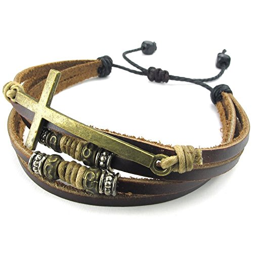 KONOV Mens Womens Leather Bracelet, Cross Charm 7-9 inch Adjustable Wrap Bangle, Brown Silver