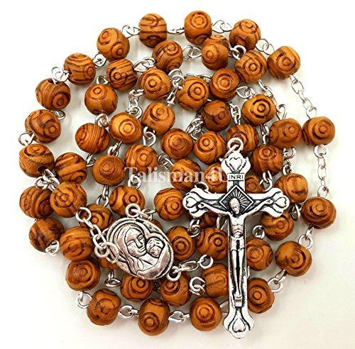 BLESSED CATHOLIC ROSARY NECKLACE Olive Wood Carved Beads With Jerusalem Soil & Cross Crucifix in Gift Box