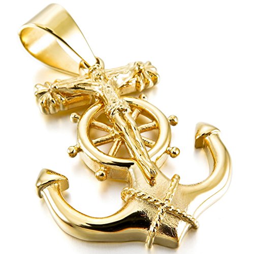 Men’s Stainless Steel Pendant Necklace Gold Tone Anchor Nautical Steering Wheel Jesus Christ Crucifix Cross -with 23 inch Chain
