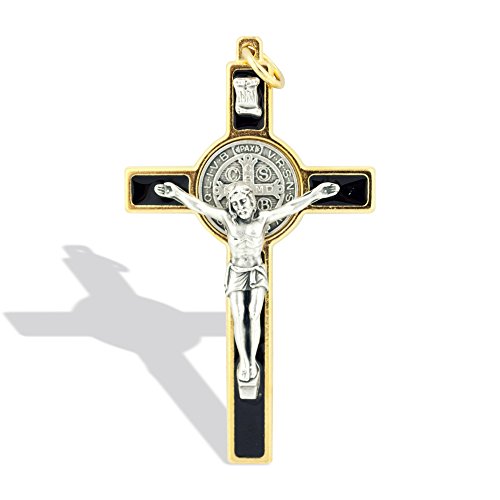 Saint Benedict Wood & Metal Crucifix Pendant 2 1/2 Inch Long with Rope Necklace Gift Boxed