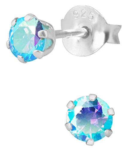 .925 Sterling Silver Aurora Borealis Aqua Crystal Round Stud Earrings for Girls, Hypoallergenic