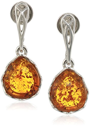 Rhodium Plated Sterling Silver Honey Amber Filigree Drop Earrings