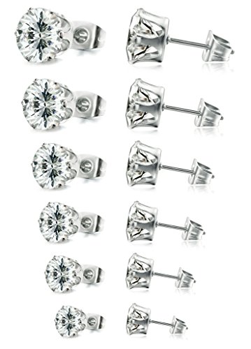 FIBO STEEL Stainless Steel Womens Stud Earrings Cubic Zirconia Inlaid,3mm-8mm 6 Pairs