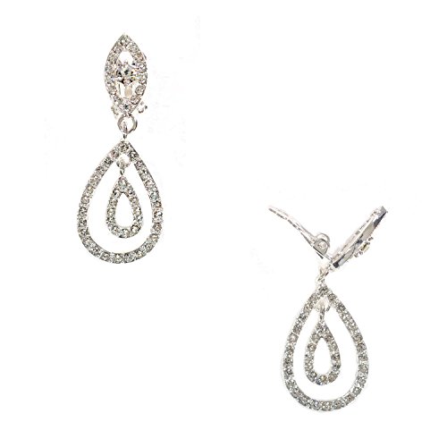 Silver Crystal Rhinestone Two Layer Teardrop Pear Shaped Dangle Clip Earrings Tipped with Eye Shape