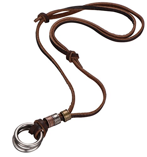 Brown Leather Necklace with Double Ring Pendant and Metal Charms, Adjustable & Unisex, By Regetta Jewelry