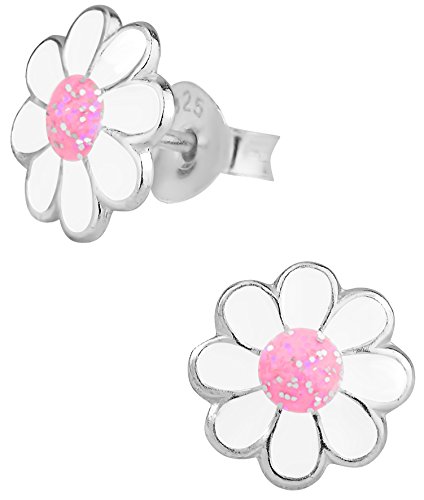 Sterling Silver Hypoallergenic Pink & White Glitter Flower Stud Earrings for Girls (Nickel Free)
