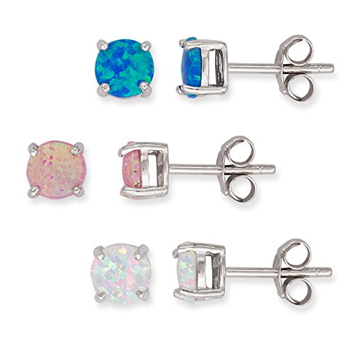 Sterling Silver Blue, Pink & White Created Opal Set of 3 Round 6mm Basket-set Stud Earrings