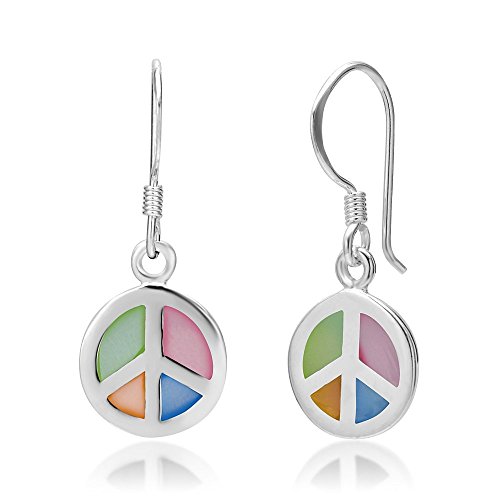 925 Sterling Silver Multi-Colored Mother of Pearl Shell Peace Sign Round Dangle Hook Earrings
