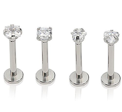 Stainless Steel Set of Top Screw Off 4 Studs 3mm Cz Studs for Labret Lip Ring Ear Earlet Tragus 16g 1/4″