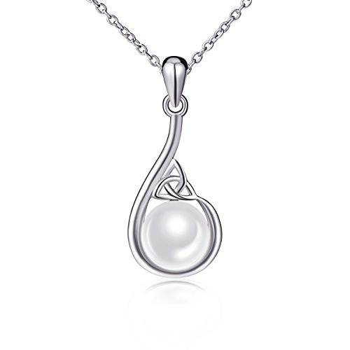 925 Sterling Silver Good Luck Irish Celtic Knot Triangle Vintage Synthetic Pearl Pendant Necklace, 18 ”