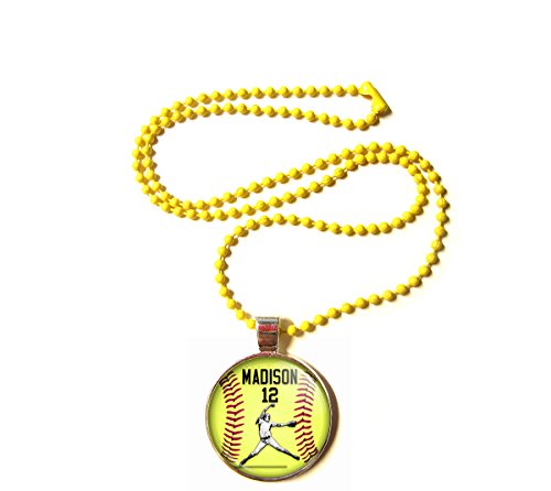 Personalized Softball Pitcher Glass Dome Necklace With Your Name And Number With Yellow Chain, Custom Softball Pitcher Name Necklace, Softball Pitcher Pendant