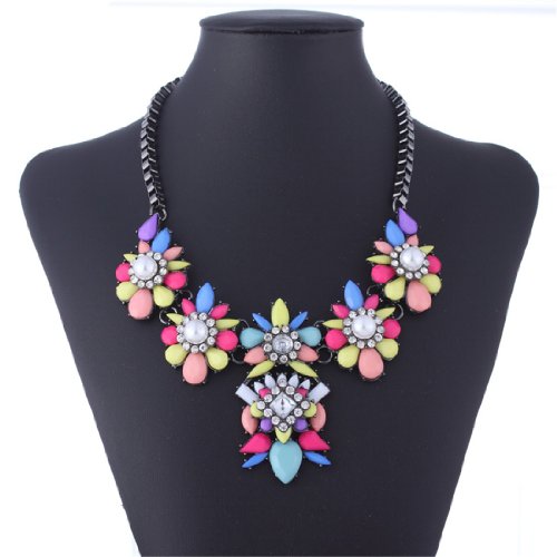 Black Chain Resin Flower Beaded Y Bib Statement Choker Necklace