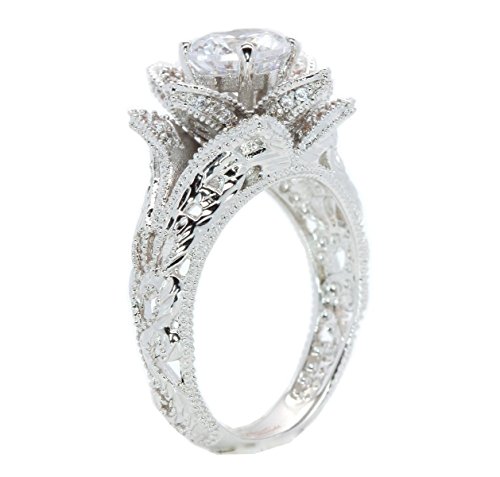Hand Carved Vintage Inspired Blooming Rose Flower CZ Cubic Zirconia Engagement Ring