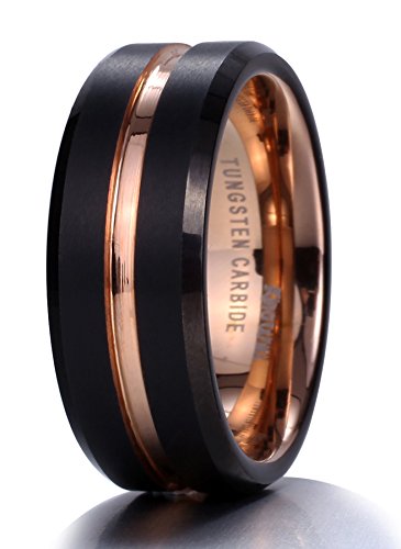 King Will Mens 8mm Black Matte Finish Tungsten Carbide Ring 18K Rose Gold Plated Beveled Edge Wedding Band